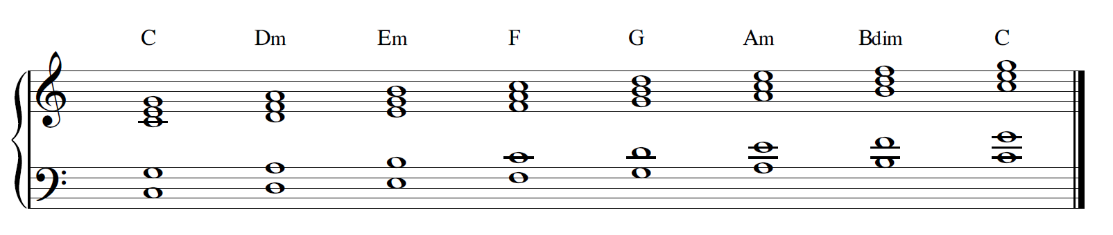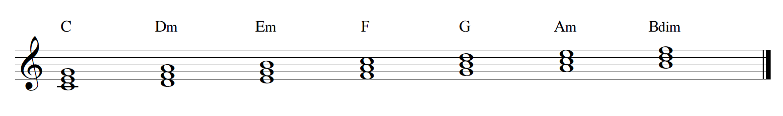 Before learning how to play in a ballad style, we have to understand which chords work in different keys. Below shows you all the diatonic chords in the key of C major. The Bdim is short for B diminished and sounds dissonant to the ear. Use this chord with discretion!