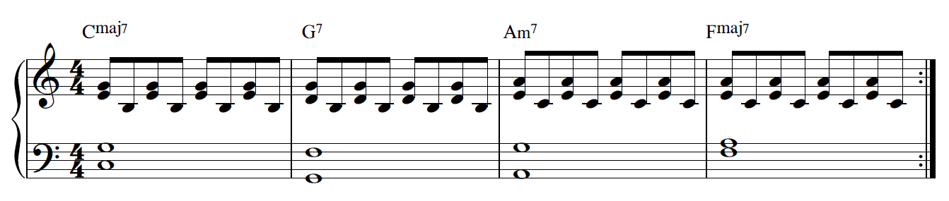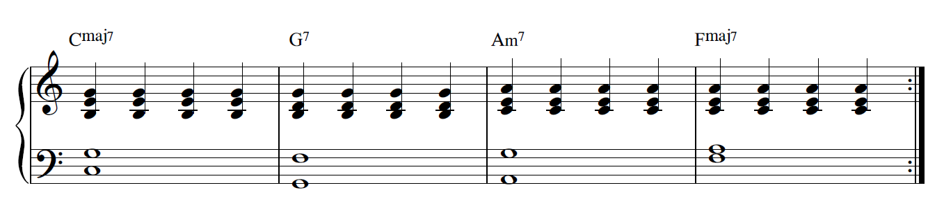 Let’s do the same with the seventh chords in crotchets. Notice that G7 and Am7 are the same voicing, with each note moving up the C major scale in each hand.