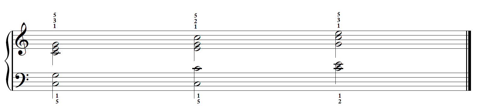 Below shows all three voicings for C major, in root, first and second inversions, with the appropriate fingerings. For the first inversion, use the octave in the left hand. For the second inversion, shape the left hand using the first and third notes in the scale.