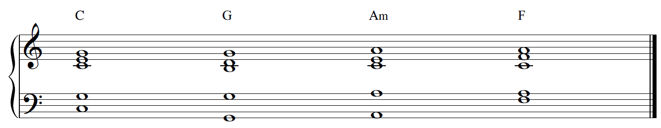 Using the following chord sequence of C-G-Am-F (featured in Don’t Stop Believing by Journey, and many others) in root, first and second inversion position, we can make the movement between each chord a smooth transition.