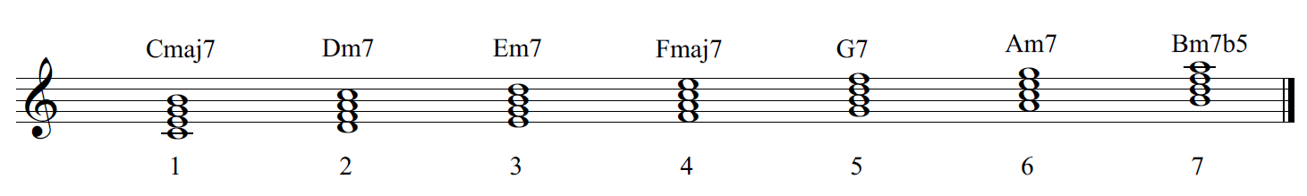 Below shows the diatonic sevenths in C major. Again you can hear the seventh degree (Bm7b5) chord sounding dissonant. This chord is used a lot in jazz.