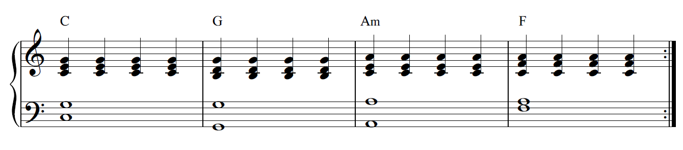 You can see below that the top note G stays the same for both the C and G chords before moving up a tone to note A for chords Am and F. Notice that the lower two notes in the right hand don’t move too much either, mostly moving up or down a tone.