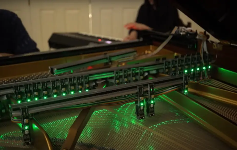 The piano features a series of electromagnets, one for each note, which are suspended above the strings of a grand piano. Each one is controlled through a MIDI interface.