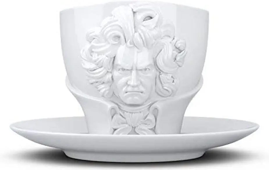 Here we have a rather moody Beethoven mug. We can only laugh at the thought of being frowned down at by Beethoven as we sip our morning coffee.
