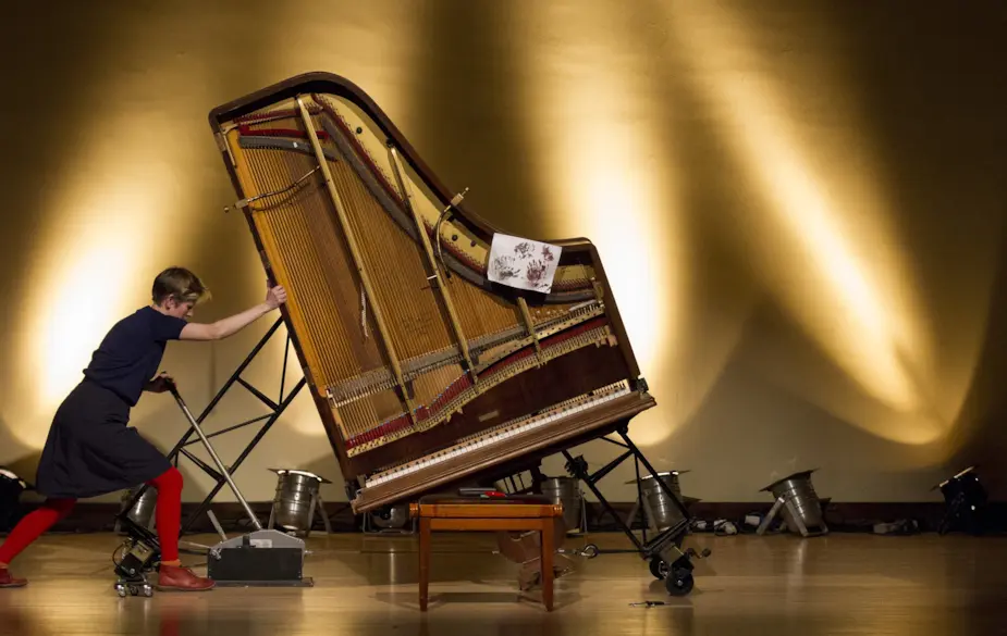 She invented the ‘inside-out piano’, a sculptural feast of an instrument played, pushed and swung. Nicolls explores all kinds of technological features on the inside-out piano, which she combines with the acoustic aspects of the instrument. The result?