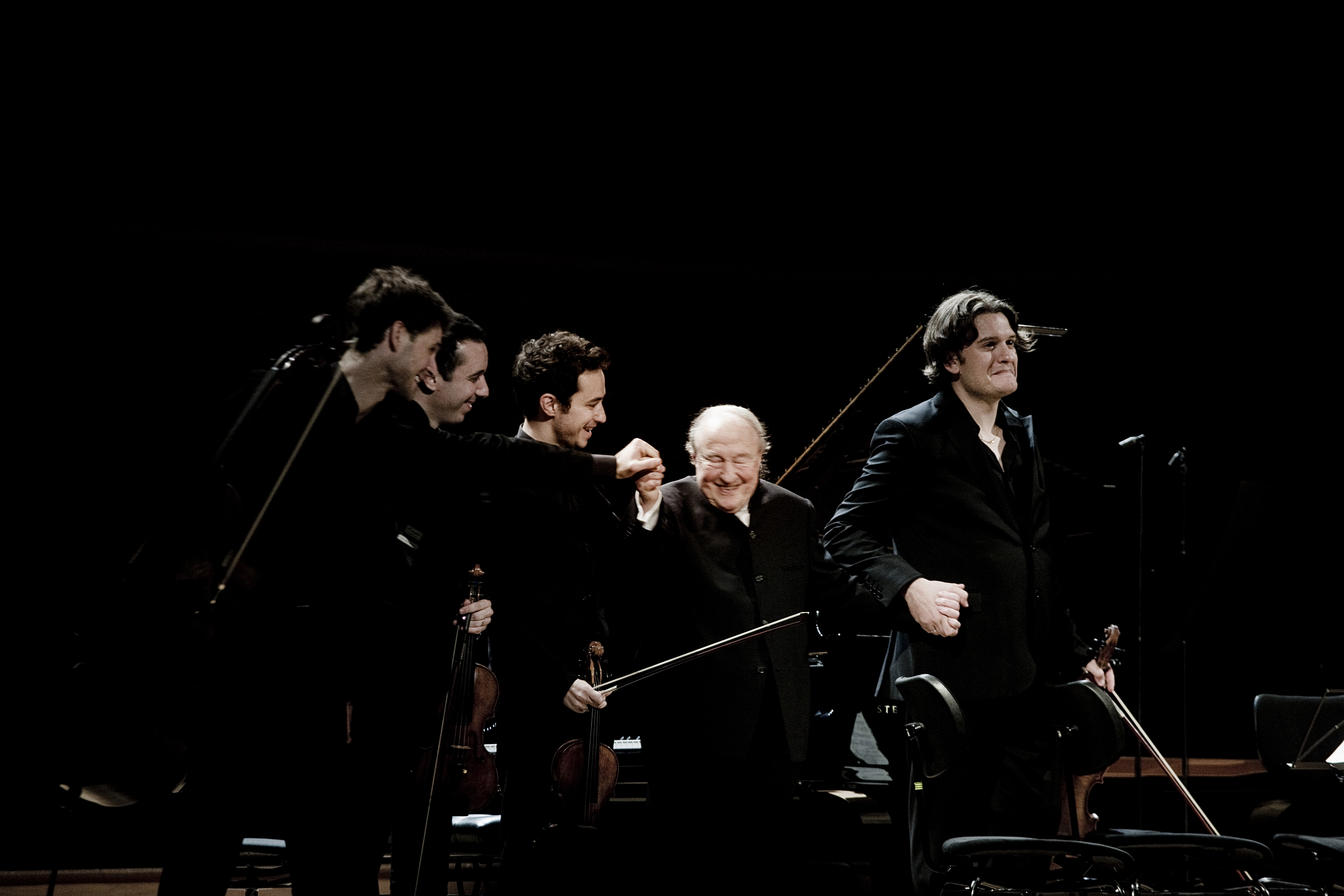 Pressler (second from right) after performing with the French string quartet, The Ébène Quartet, on his 90th birthday