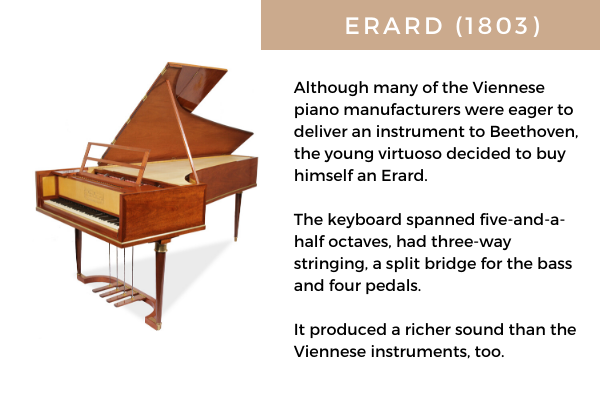 Crucially, in terms of his position as an influencer, Beethoven was not loyal to the Viennese brands, preferring instead to go where his heart led him. For example, in 1803 he owned an Erard that was so different in sound, touch, pedals and registers that no Viennese builder could match it.