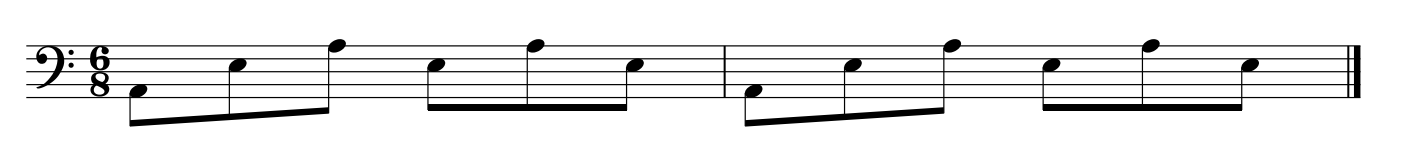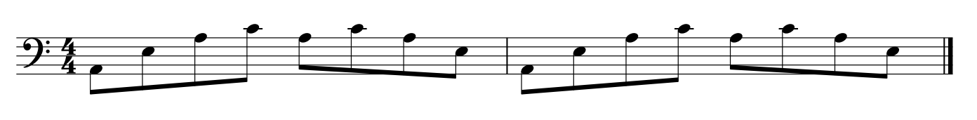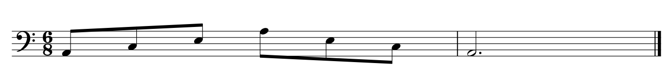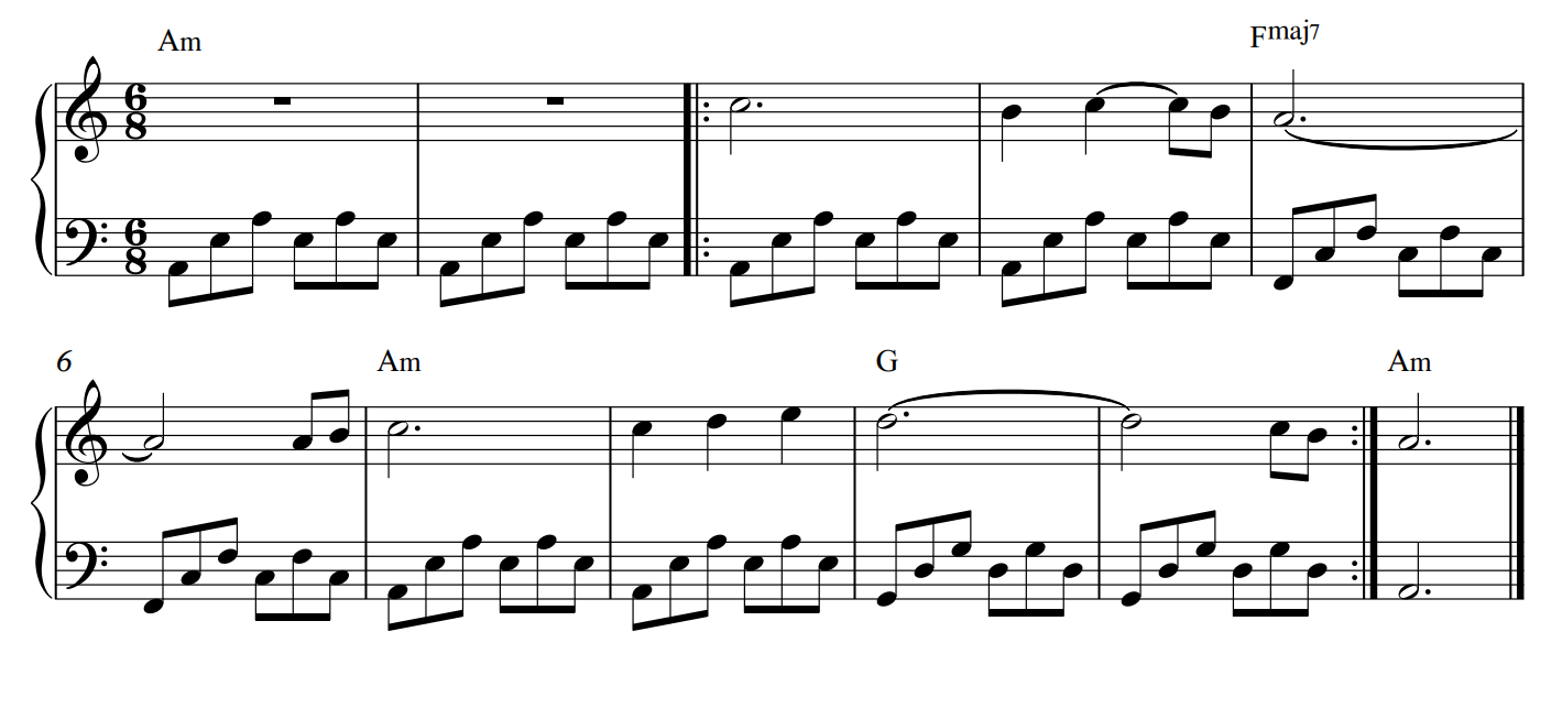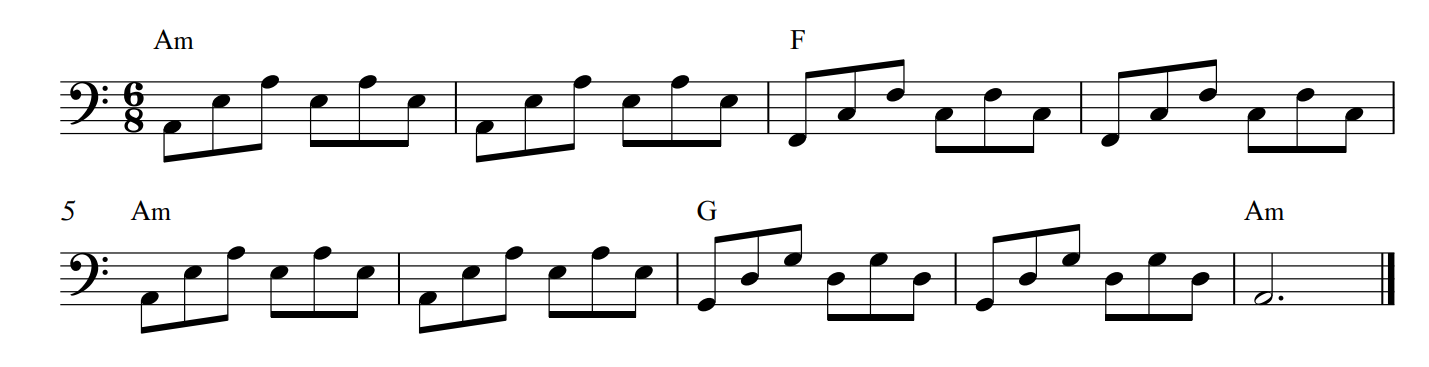 a) To create an arpeggio, use the first, third, fifth and octave notes from any major or minor scale. Shown below is an arpeggio in Am using 6/8 time.