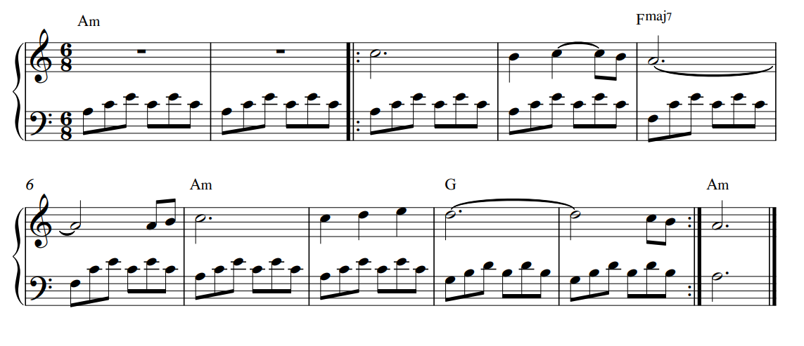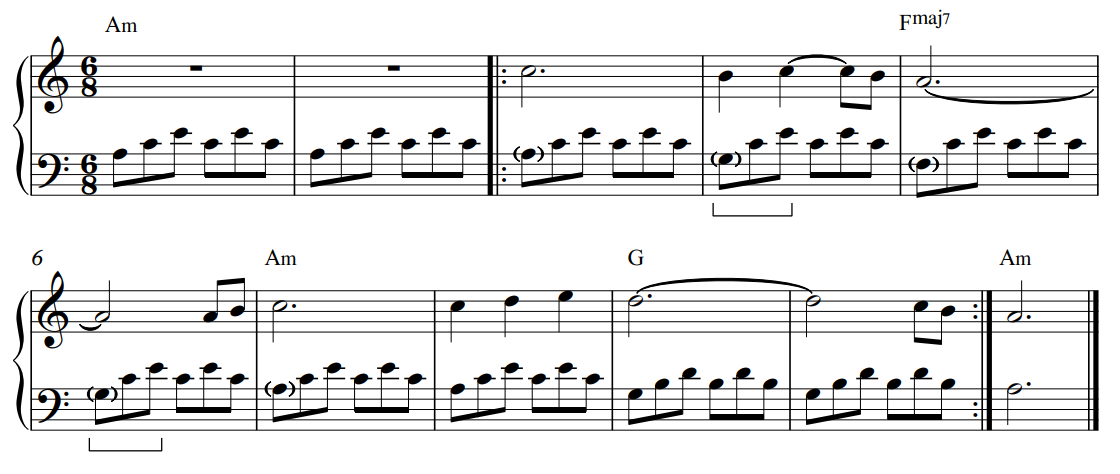 Using chord inversions will create bass lines. Shown below in bars four and six, indicated by brackets, is a C major broken chord in second inversion. Using this inversion creates a ‘scale-like’ bass line indicated by ( ), creating a smoother transition between the Am and Fmaj7 chord.