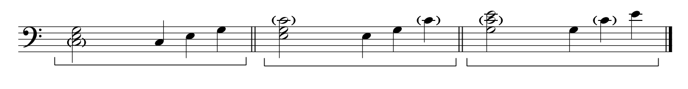 It’s a good idea to learn broken chords in root, first and second inversion. This will create smoother transitions between chords. Shown below is C major. Note where the root note is located ( ).