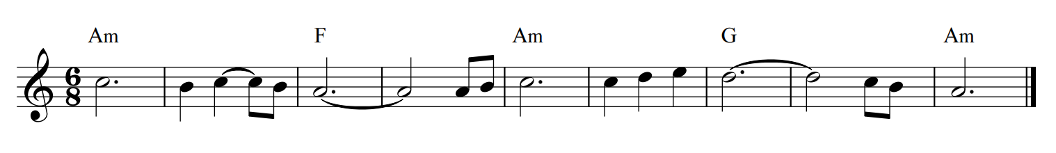c) Work out a four-note (4/4) or three-note (3/4, 6/8) melody or motif, starting with either A, C or E from the A minor chord. These three notes are called chord tones. Use passing notes (B and D), to either ‘pass through’ the chord tones, or other notes from the A minor scale to create a motif or melody and land on a chord tone from the next chord.