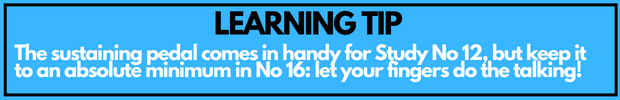 This study trains a basso cantabile or singing style. To cultivate the required rich timbre, make sure that your fingers are well connected to each key. Stay close to the keys, with the wrist and arm providing sufficient weight for a warm sound, so that the melody may sing freely above the RH chords.