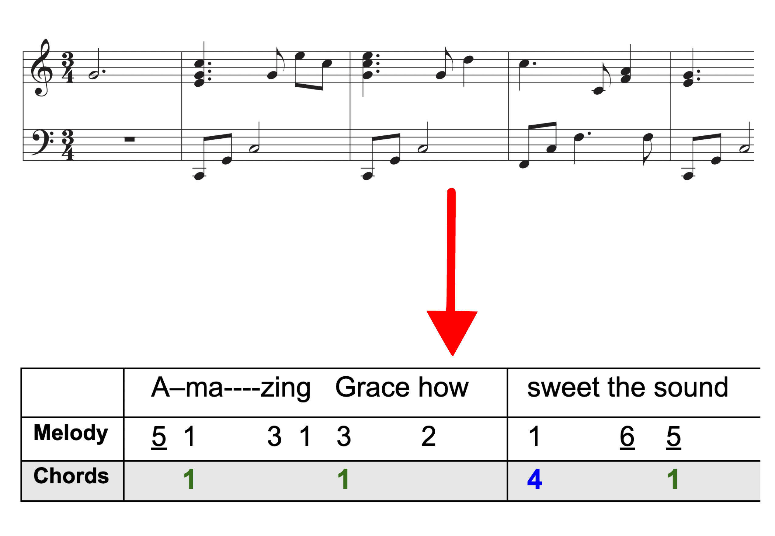 The DecPlay music format uses 'relative numbers' enabling you to play in any key from the same song sheet. When playing in the key of C, this would be: