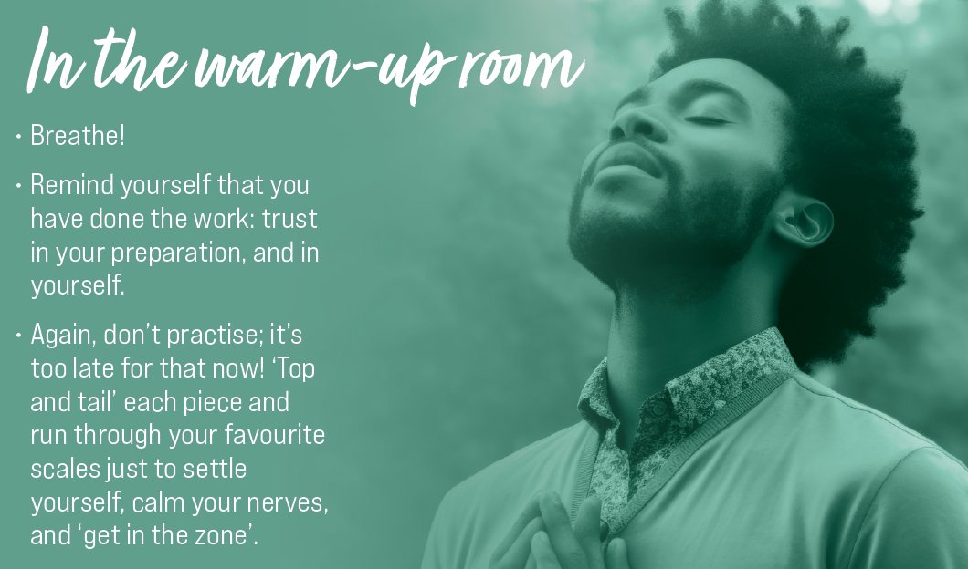 Especially as the date draws nearer it’s easy to fixate on ‘problem areas’ that loom ever larger. Dealing with them is a delicate balance of caring enough that you work hard to ensure you can get through the problematic passage with minimal disruption, and caring so little that you don’t anticipate the issue by rushing the tempo, physically tightening, or otherwise making a challenging task even harder!