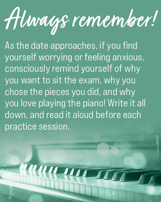 Given that it all has to be right the first time round, begin by sitting at the piano, and rather than ‘practising’, play through one of your pieces, warts and all, then stand up and get on with your life. Once you can do this successfully, experiment with combinations of two pieces, then three, before finally sitting down and playing your entire programme in one sitting. Regardless of whether you’re preparing for a live or recorded exam, this is a really powerful skill. Professionals make lots of mistakes. This might not mean that they play lots of wrong notes, but rather that they don’t play the right ones quite how they wanted to.
