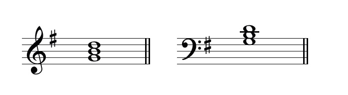 When all three notes of the triad are positioned as closely together as possible within an octave, as in the examples in the previous column, they are said to be in close position. But, of course, they can also be in different positions when the notes of the triad are spread further apart. When the notes are not confined to being next to each other within the octave they are said to be in open position.