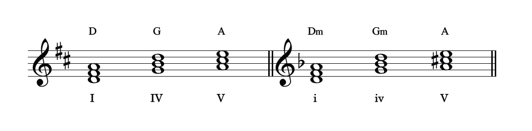 These numerals are particularly useful when analysing a piece of music. When the chord is a major chord it is labelled with an upper-case symbol; when it is a minor chord it is labelled with a lower-case symbol. So the tonic and subdominant triads of a major key are labelled as I and IV, in a minor key they are i and iv. These numerals are usually placed below the bass stave.