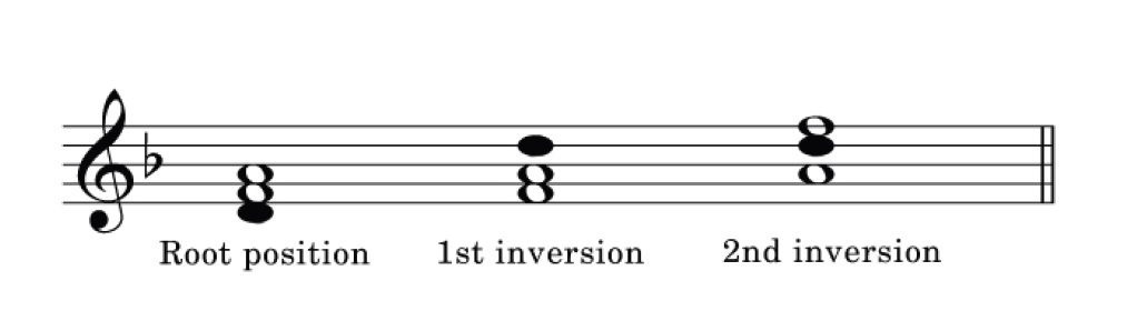 The triads we’ve covered so far have all had the tonic note, called the ‘root’, as the lowest note. These are called root position triads. However, often a chord is arranged so that the root is not the lowest note and perhaps the 3rd or the 5th is at the bottom of the texture. When the 3rd is the bass note (or lowest note) of the chord, the triad is said to be in first inversion.