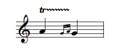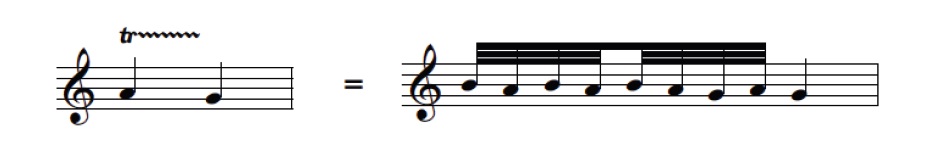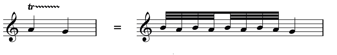 The most common ornament is the trill. A trill is a rapid alternation of two notes a tone or semitone apart. This is shown by tr above a note or tr~~~~~~~~~~. The exact way in which this is interpreted depends on the style and tempo of the music. These aspects will affect the number of repetitions and their speed. In music written before about 1825-30 – Renaissance, Elizabethan, Baroque and then Classical music up to the time of Beethoven – trills generally start on the note above the main note. This gives an even number of notes:
