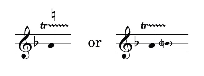 If the upper note of a trill needs an accidental, this is shown above the tr sign or in brackets above the note: