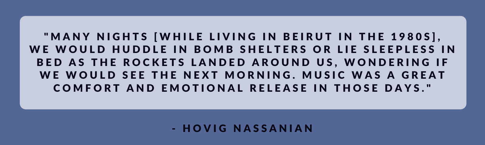 A few delightful lullabies dedicated to his son follow – “often played while he was still in Anna’s belly!” – before we reach track seven; the poignant Tonight. This was a piece Hovig composed during his time living in Beirut in the 80s. “I was 15 back then - and living through very dangerous and challenging days in Beirut during the civil war. Many nights, we would huddle in bomb shelters or lie sleepless in bed as the rockets landed around us, wondering if we would see the next morning. Music was a great comfort and emotional release in those days."