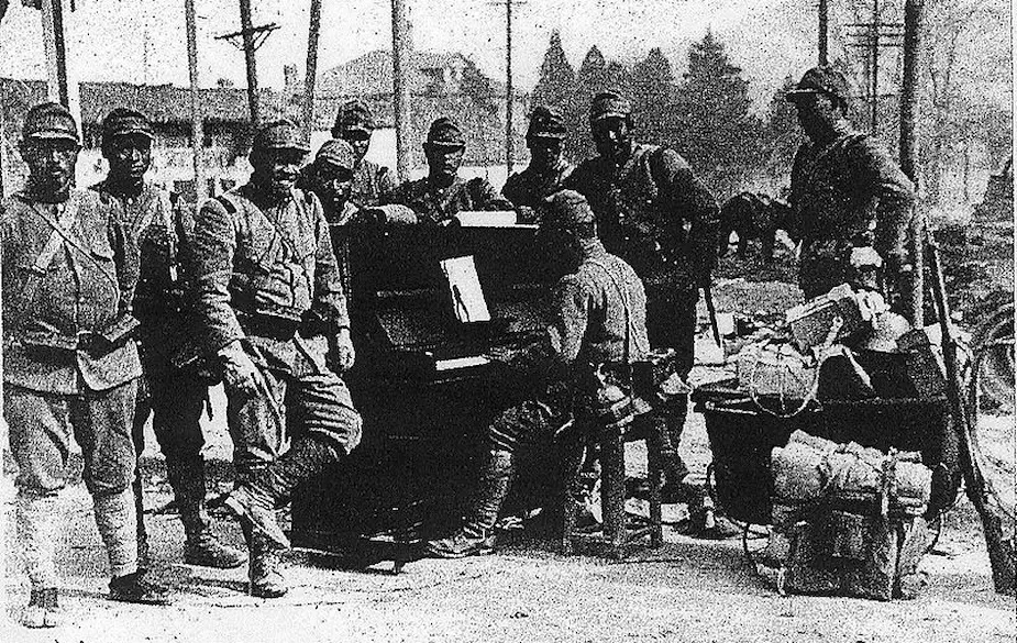 Main image: A group of Japanese soldiers in WW2 enjoy a break with a piano