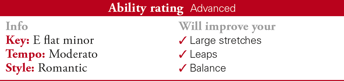 When you begin to read through the Elégie you will immediately notice the parallels between it and Chopin’s Nocturnes. This is particularly apparent in the left hand (LH), over which the right hand (RH) sings the most glorious melody. As with Chopin’s Nocturnes, it is very important to master the LH first. Along with learning the climax (bars 63-82), my top tip is to learn the LH alone first. You can even try singing the RH over the top of your LH playing!