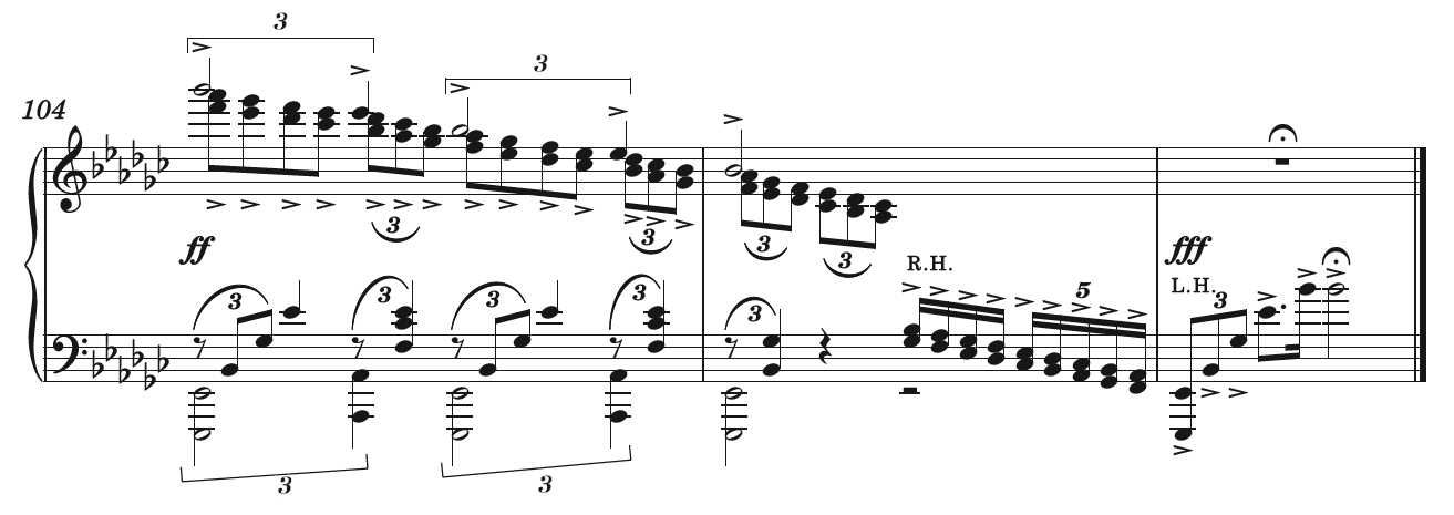 At bar 105 you’ll see that the very top notes are Bb, Eb, Bb, and so on. These need to ring like bells; something that Rachmaninov was obsessed with his entire life. The Elégie ends with a declamatory phrase that is powerful and creates the perfect sense of finality.