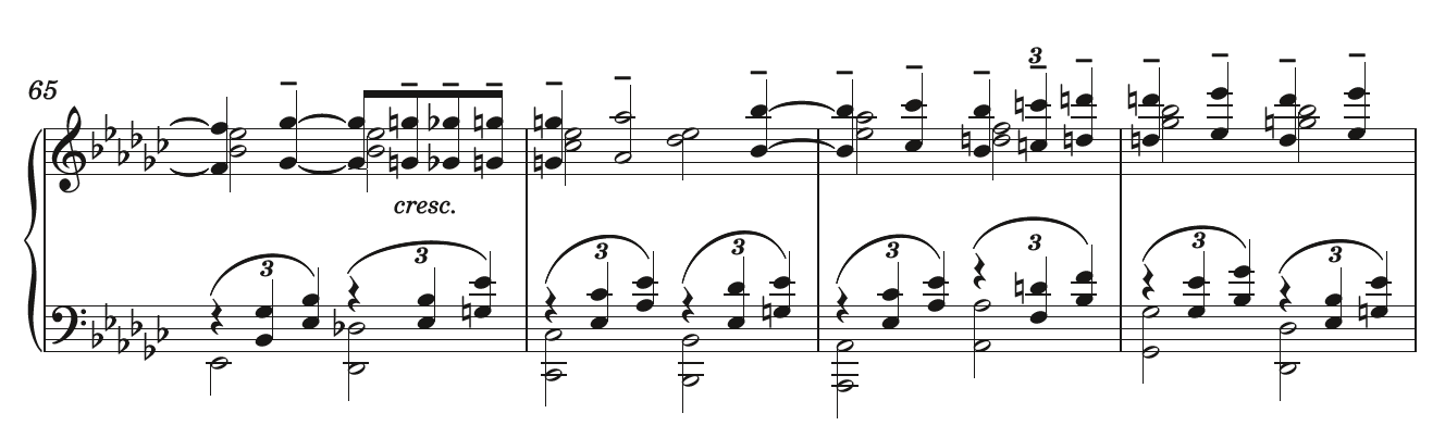 The RH can be technically quite tricky at this point. Again, I would recommend the practice of ‘breaking down’ from the upper to lower part of the RH. This means you will play Eb followed by Bb, then Db followed by Gb, and so on.