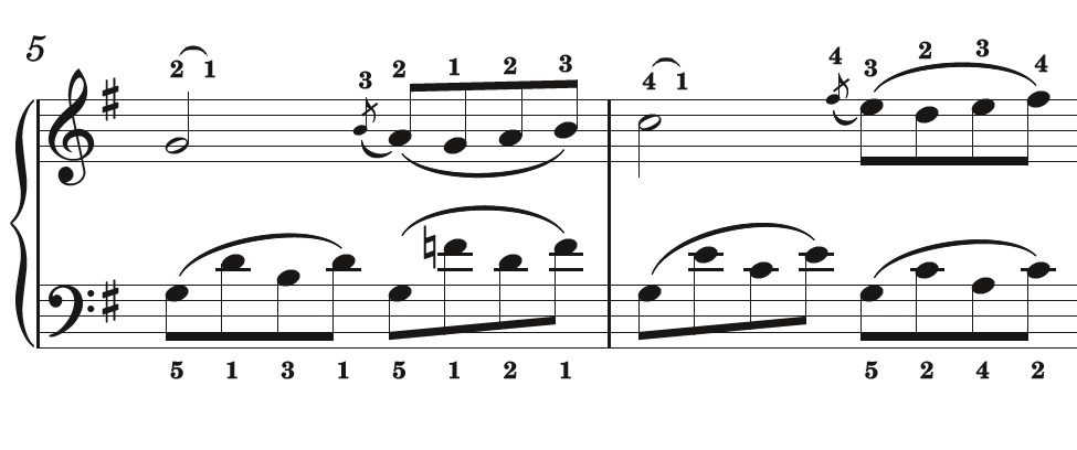 For example, in bar 2 the second, third and fourth beats – a G major broken-chord figure – can be played effectively by keeping the hand in the tonic chord position.