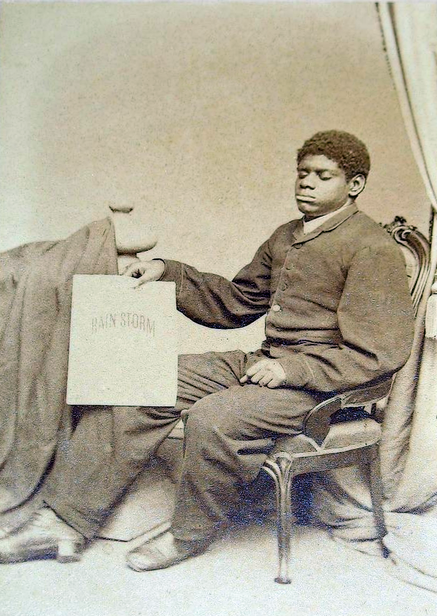 Tom Wiggins holds up a copy of his first composition, 'Rain Storm'. 1861. ©W. L. Germon of Philadelphia, Public domain, via Wikimedia Commons.