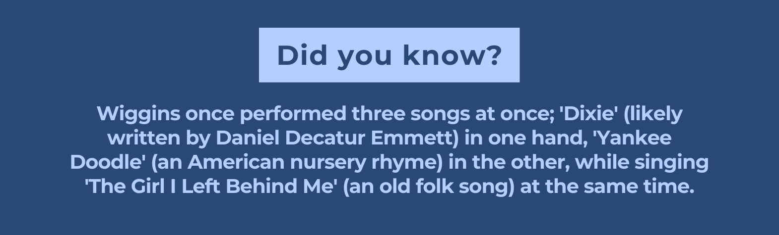 After being paraded around as 'circus act' to the southern states, Wiggins' reputation grew so much that he was invited in 1860 to perform at the White House in front of American President James Buchanan. This made him the first African-American to give a command performance at the White House.