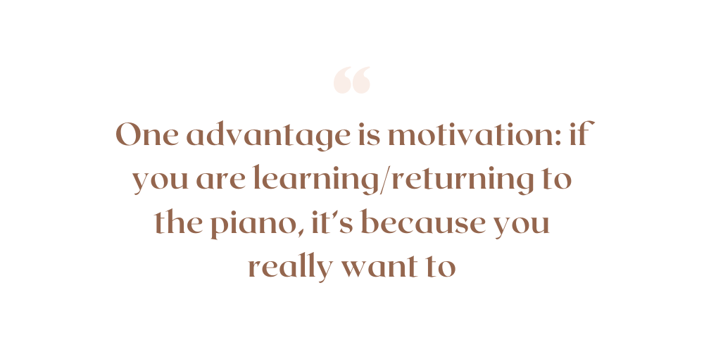 Another advantage is motivation: if you are learning/returning to the piano, it’s because you really want to. You haven’t been pushed by a tiger-mom, or a helicopter dad. And, as all teachers know, motivation removes enormous hurdles in the path of progress.