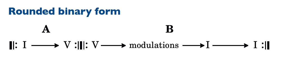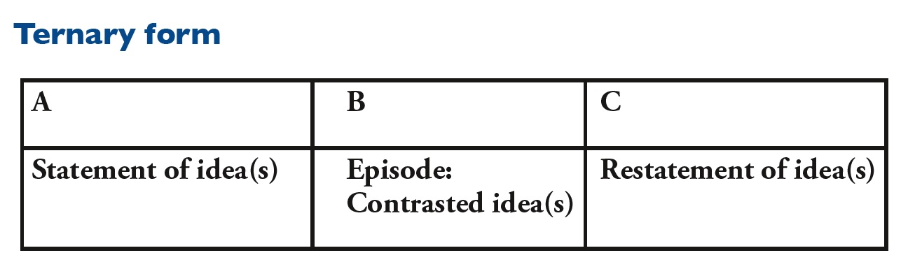 Such a form is clearly heading towards being more properly considered as a three-part structure and some theorists have preferred the term ‘incipient ternary’ to describe it. A piece in ternary form has three sections. In A-B-A the A sections are the same; in A-B-A the return of the A section is varied in some way. So while the two outer A sections use the same musical ideas, the B section – sometimes called an ‘episode’ – provides contrast and a sense of departure prior to the restatement of the original material in the tonic key.
