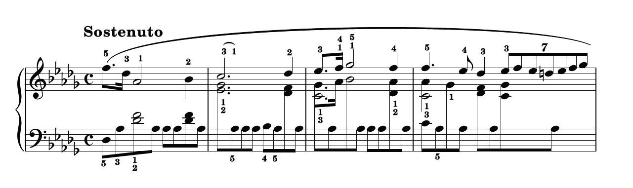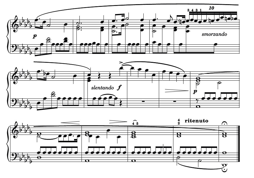 Here is a classic example of ternary form, (Alfred Cortot’s poetic title for the piece was ‘Mais la Morte est là, dans l’ombre’ – ‘But death is here, in the shadows’ – which is perhaps more appropriate than the nickname derived from George Sand’s recollection of the work’s origins.) The opening section has a luminous theme which is dominated by a mesmerising Ab. This note acts as an inner dominant pedal point: it is the anchor for the entire prélude.