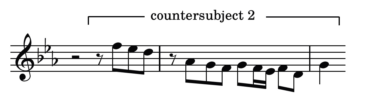 The third voice – the bass – enters at bar 7 with the subject in its original form accompanied by the countersubject in the soprano. There is then a second countersubject in the alto part which is an idea treated quite freely throughout the fugue.