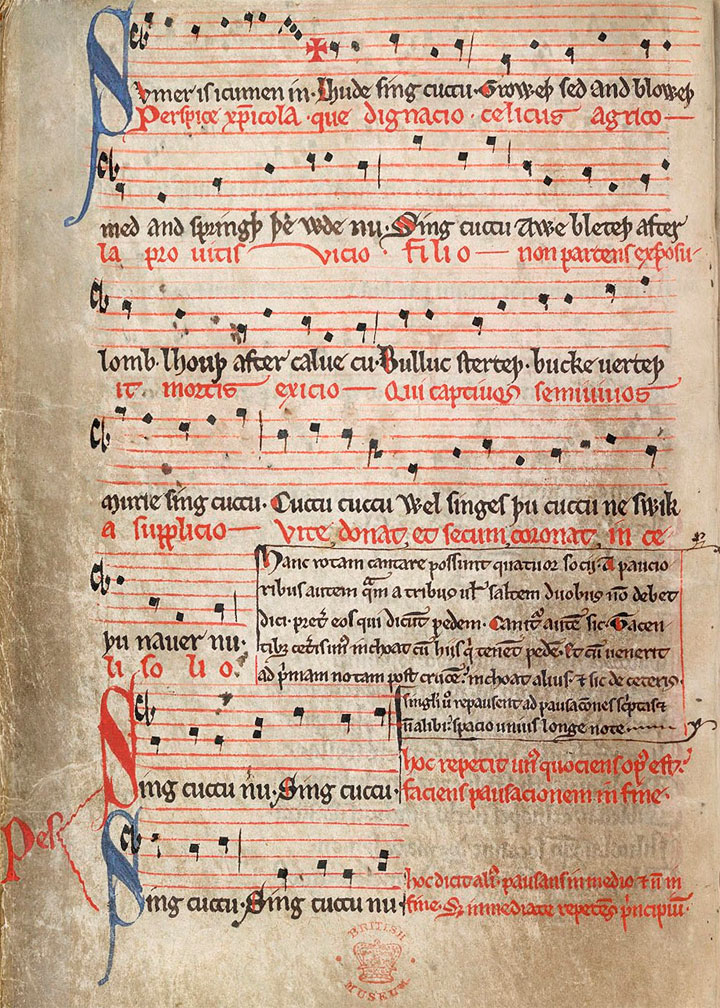 In a canon, the tune is imitated at a specified time interval by one or more parts at the same pitch. The oldest known canon and one of the most famous is a 13th-century secular song, Sumer is icumen in, a beautiful manuscript of which can be seen at the British Museum.