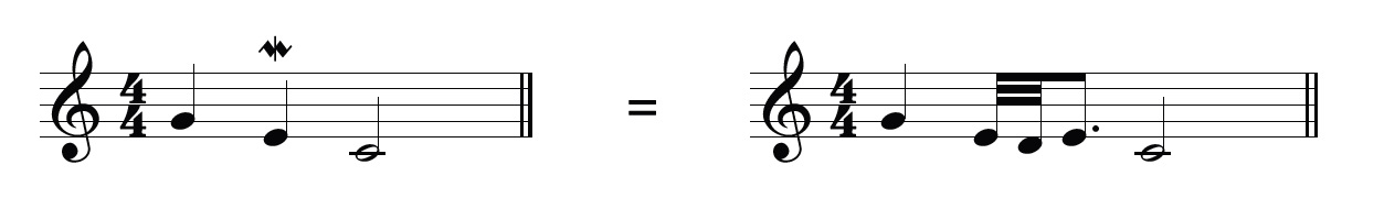 This is a decoration that ‘turns’ around the written note and was particularly enjoyed by composers of the Classical period. It consists of a note above the main note, the note itself, the note below it, and the note itself again.