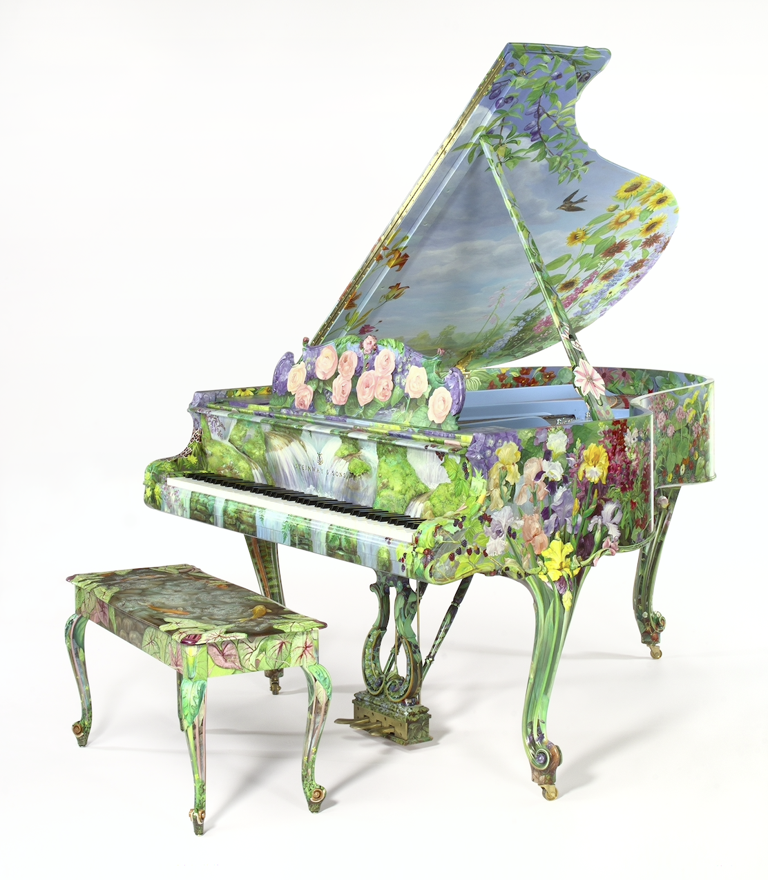 Of course, it was still then the age of harpsichords and clavichords. Many were finished in natural wood but more expensive ones were lavishly decorated. Most early pianos adopted the natural wood look. Even premium manufacturers such as Broadwood, Erard, Pleyel and Graf tended to favour the look with attention paid instead to the quality of the woods used and the placement of sections with contrasting grains. The Cobbe Collection at Hatchlands Park near Guildford has some beautiful examples of early pianos including Beethoven’s Graf with its gorgeous natural wood casework. However, among the treasures there is also a piano once loaned to Liszt in around 1875 that is finished in black. Made in Italy by Carlo Ducci, the upright’s only concession to decoration is a couple of ornate candlestick holders and two brass handles on the sides for moving it. It’s important because around the same time, black had become a popular colour associated with Japanese culture and, in particular, East Asian lacquer work. A technique called japanning, designed to mimic the region’s black lacquer, emerged and became popular as a finish for pianos. ‘There was a real vogue for black, highly glossy lacquer,’ says Adam Cox, founder of Cavendish Pianos. ‘Not only was it attractive on a piano but using it meant you didn’t need to have such good figuring [the pattern of the wood grain].’