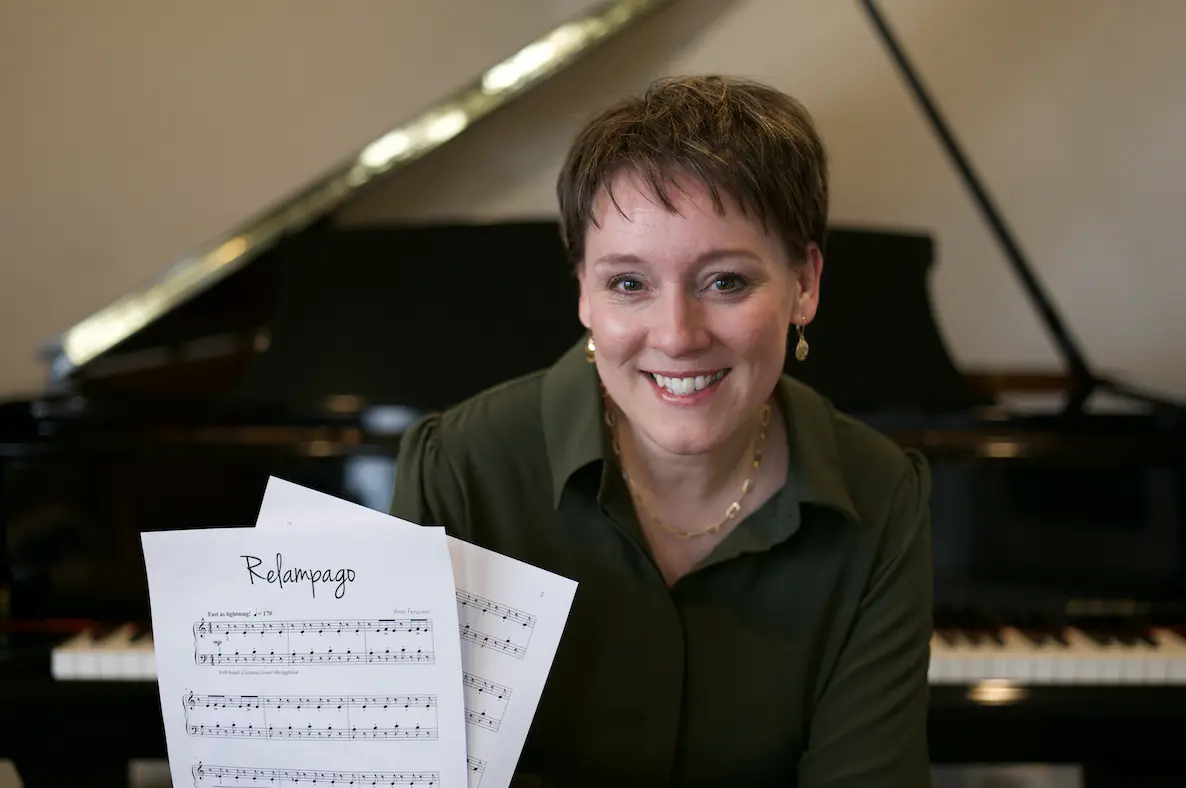 As for composing, ‘It has always come very naturally to me,’ says Ferguson. ‘When I started kindergarten, I had a little tape recorder and a stack of blank cassette tapes. I loved singing, making up songs and recording myself so I could go back and listen to them. This is still how I compose today!’ She continues: ‘I loved listening to classical music, and if I turned off the radio mid-song, I felt like – even if I had never heard the piece before – I could continue it in my head and create the entire ending. I’ve composed many pieces for my own students. We like to have themed recitals, so if I can’t find a piece that fits a student’s needs or the theme, I write one!’