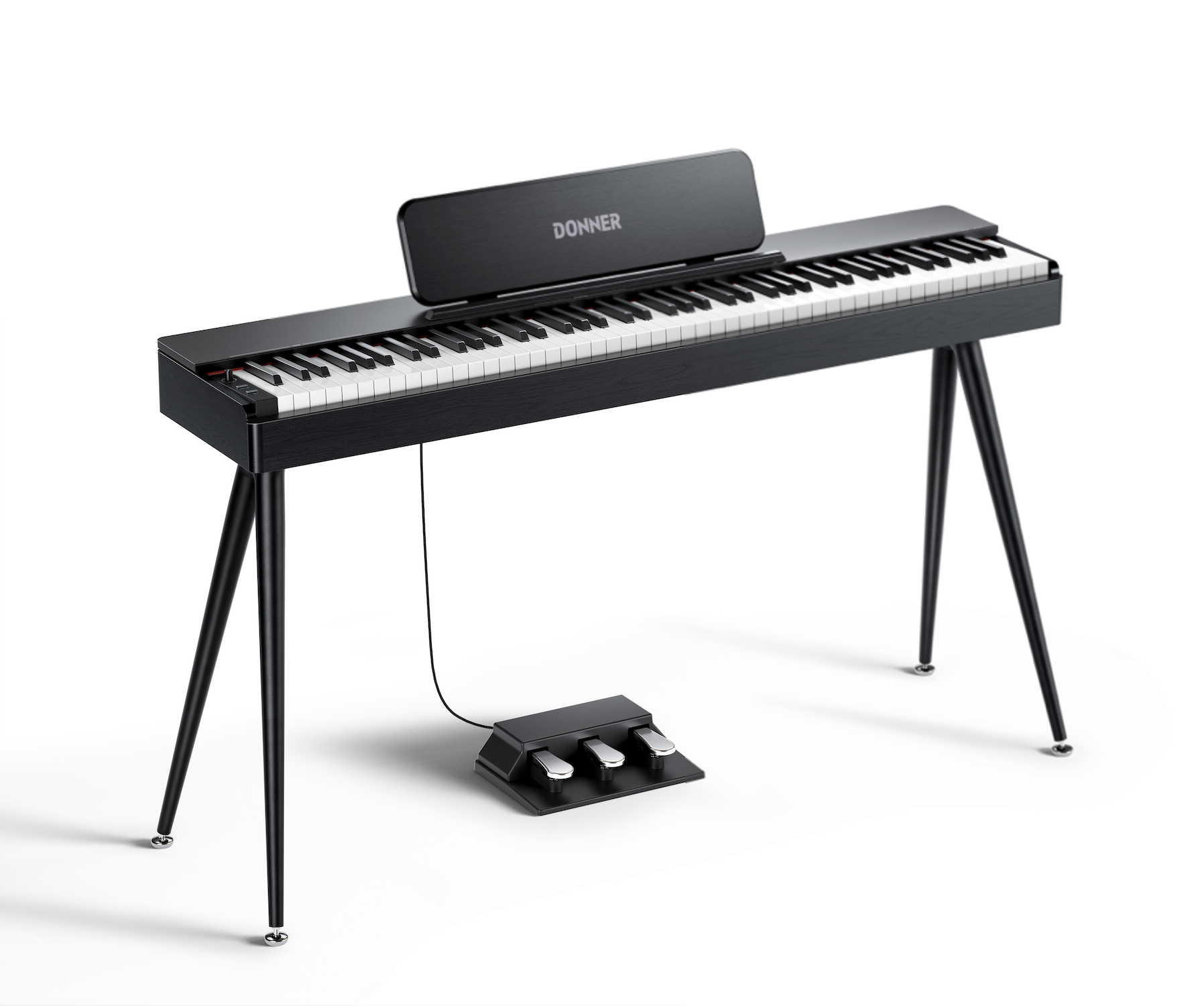 The DDP-80 Plus digital piano is an upgraded version of the DDP-80 with keyboard cover. Its sound is of a French grand piano and, accordingly, it is of a vintage design with sleek, slanted legs that ensure it will fit comfortably into any environment. It is made with eco-friendly, low-formaldehyde materials. The DDP-200, the fourth model in the range, benefits from Donner’s Dynamic Grand Hammer keyboard that mirrors very closely the feel and responses of a grand piano. It’s a fully featured digital piano with grand piano-like pedal operation, a choice of immersive grand piano sounds, powerful speakers, an LCD screen and full connectivity. Despite all this, the DDP-200 is a compact instrument whose elegant appearance allows it to blend with contemporary aesthetics.