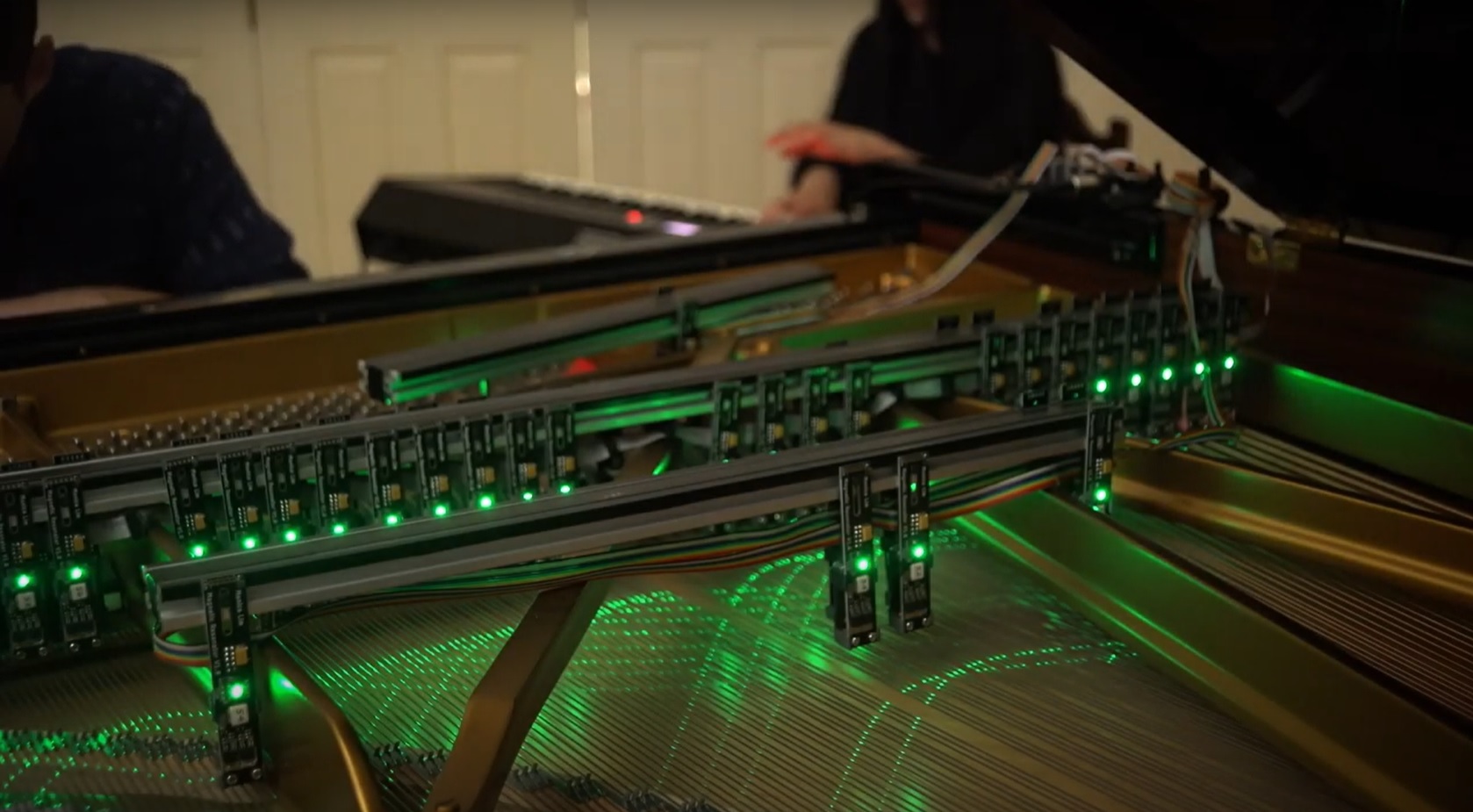 The piano features a series of electromagnets, one for each note, which are suspended above the strings of a grand piano. Each one is controlled through a MIDI interface.