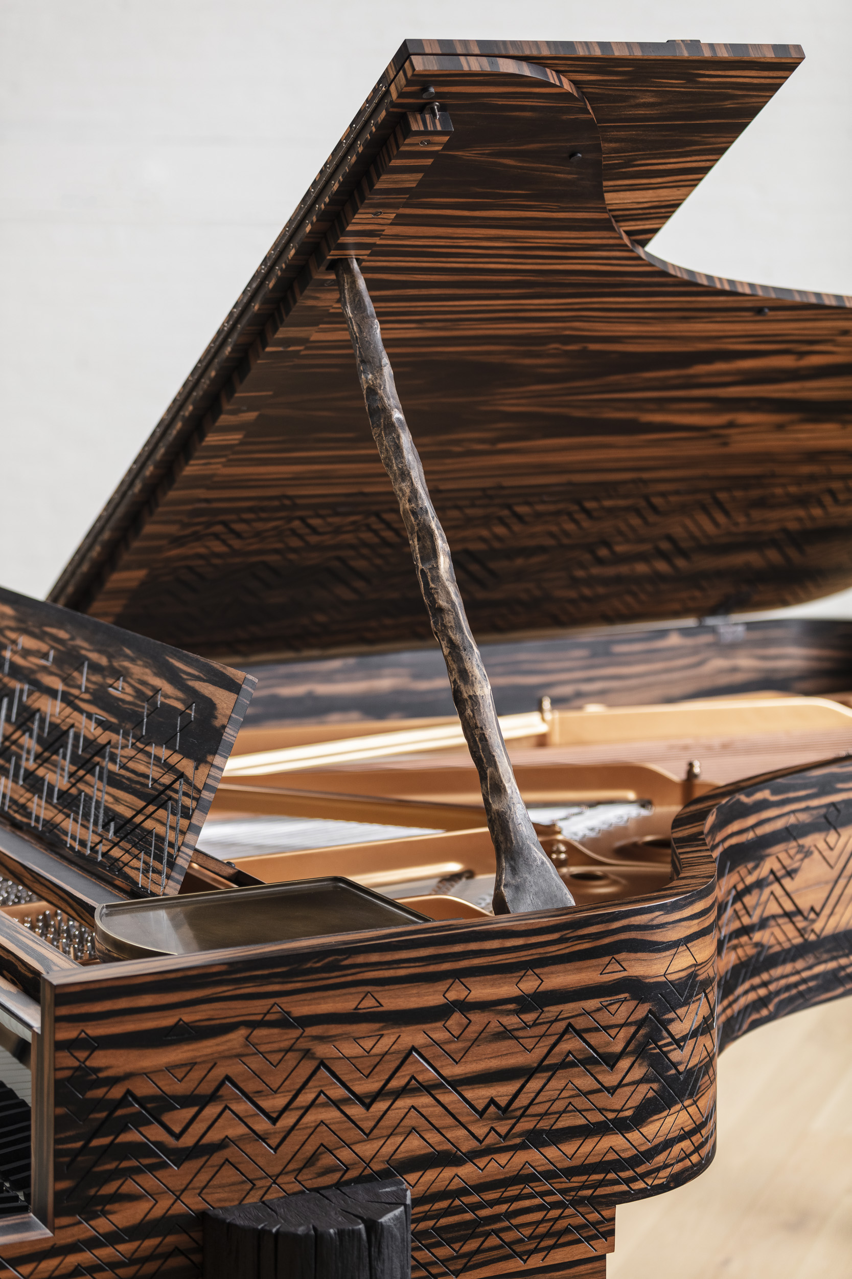 The piano is comprised of 15 layers of hard rock maple and rare Macassar ebony personally selected by Lenny Kravitz for the exterior. The Model B features hand-carved motifs on the piano rim, the inner lid, and music desk requiring over 200 hours of carving by Steinway artisans, and hand-carved, block-style piano legs in black ebony finish.