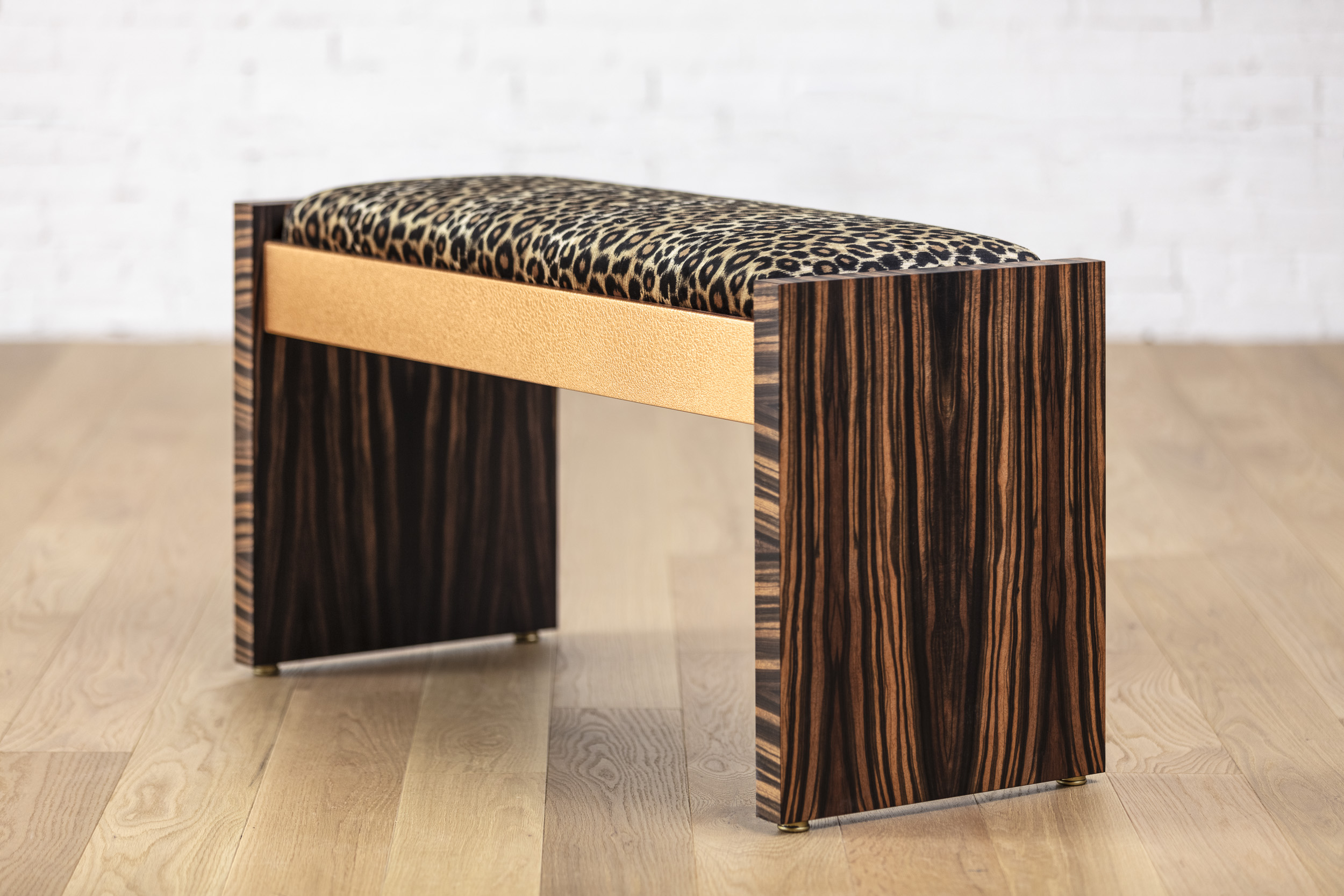 The piano keys are in ebony and matte cream, and the handcrafted piano bench features Macassar ebony from the same flitch of wood found on the piano and a faux cheetah print fabric. The finishing touch is the Steinway and Spirio logos inlaid in faux tortoise by Pearl Works.