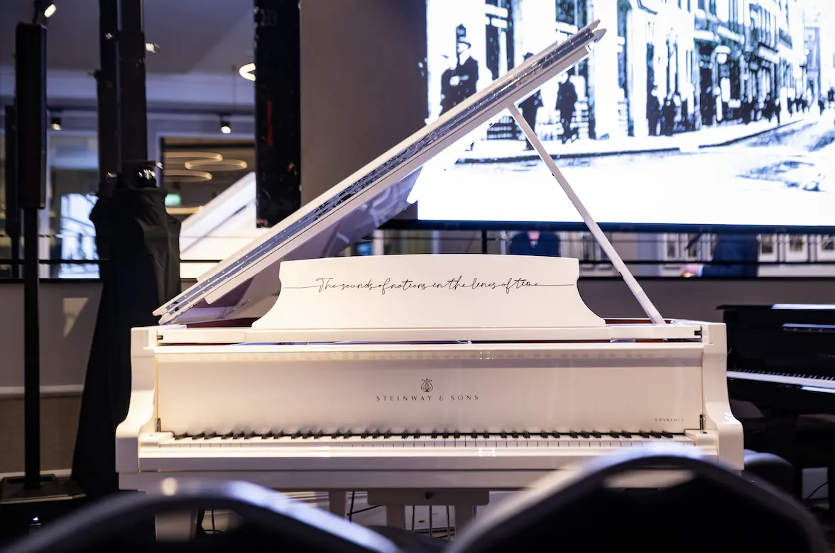 The piano, which is called the Steinway Hall London 150 Years Anniversary Limited Edition, was designed to honour 150 years of Steinway Hall London. This exclusive Limited Edition – available in Model b Spirio | r (limited to five pieces) and Model D-274 Spirio | r (limited to 3 pieces, made-to-order) is finished in White RAL 9010 with chrome fittings and features an inner mahogany rim, silver cast-iron plate, and a specially designed medallion marking its rarity. Its defining feature is the hand-drawn artwork adorning the outer rim — a continuous line-drawing timeline titled The Sound of Nations in the Lines of Time – celebrating 150 years of British musical and cultural history intertwined with Steinway’s legacy in the UK.