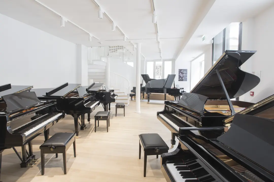 The new showroom is located in the glamorous district of St-Germain-des-Prés. Spread over two floors, in many oak-floored, stylish white salons, the 700-square-metre space incorporates a 50-seat auditorium (below), two practice studios and sufficient space to house up to 45 instruments.