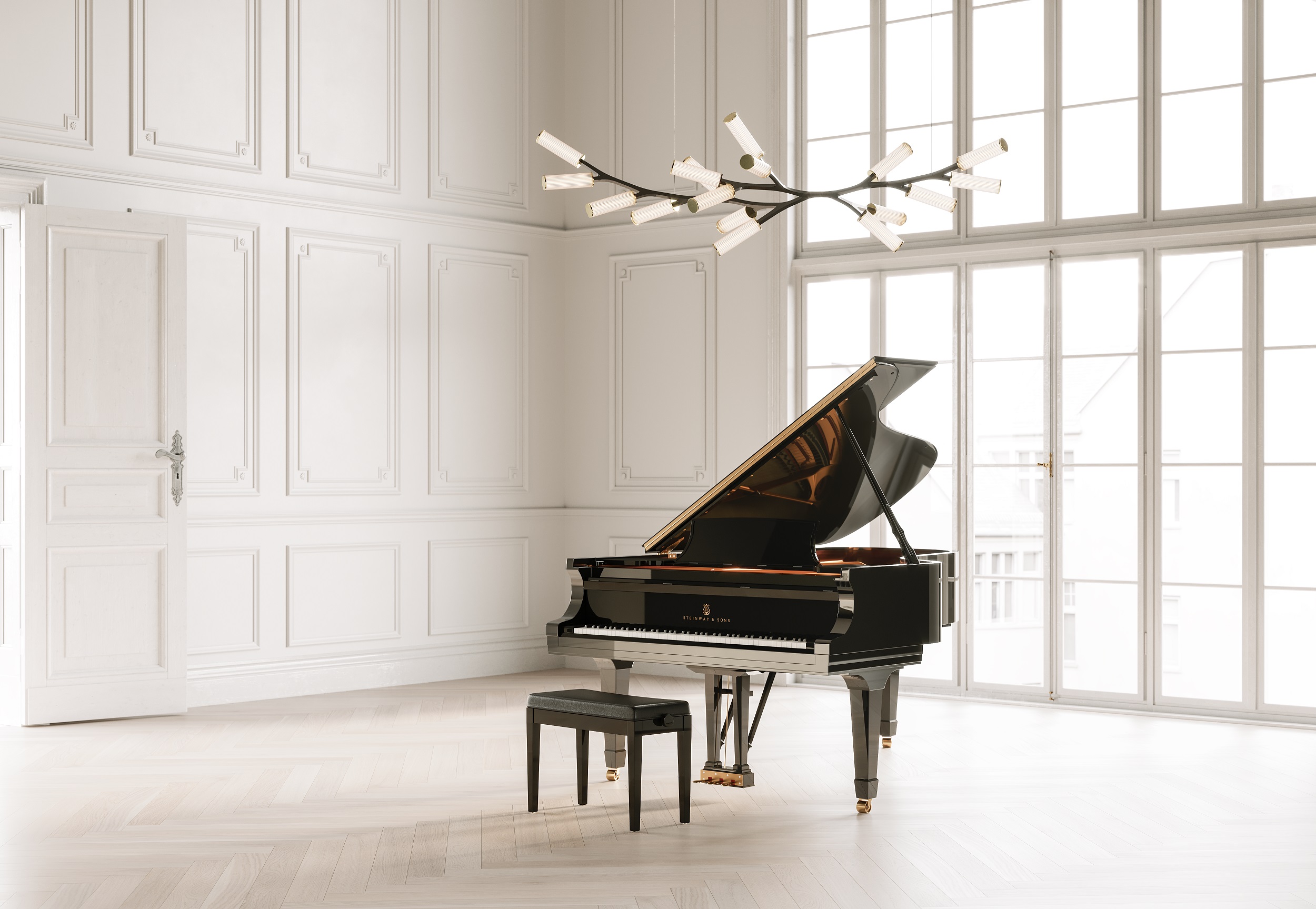As well as being inspired by Steinway’s classic design, the chandelier also aims to evoke a weeping willow with its delicate yet structured look.