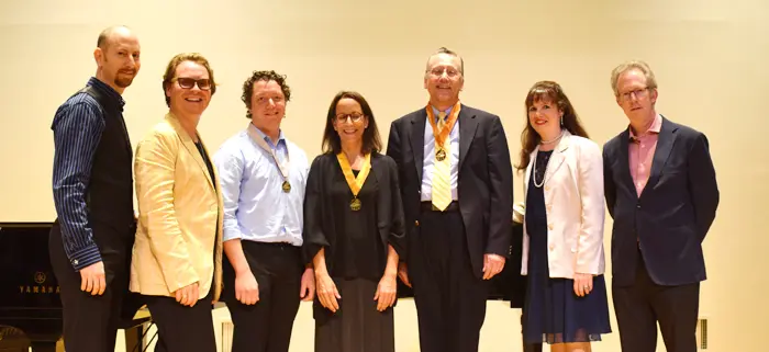 Left to Right - Adam Neiman & Konstantin Soukhovetski, judges, Noah DeGarmo (2nd place), Michelle Steffers (1st), David Swenson (3rd), Melanie Spanswick, judge and Thomas Zoells, PianoForte Foundation